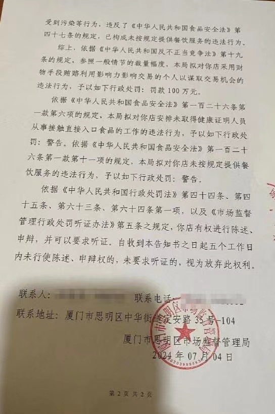 中国政法大学教授李建伟近日在社交平台发布一份福建厦门市思明区市场监督管理局的行政处罚告知书,该区一家小饭馆收到了高达百万的“罚单”。