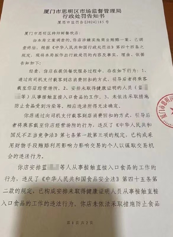 涉事店铺“帅帅鲜餐饮店”法定代表人师新帅向澎湃新闻表示,他平时在修车,这家店铺今年2月份才开业,主要是其他股东在负责运营,对于店铺和司机之间的“消费回扣”情况不太了解,7月8日收到这张处罚告知书。