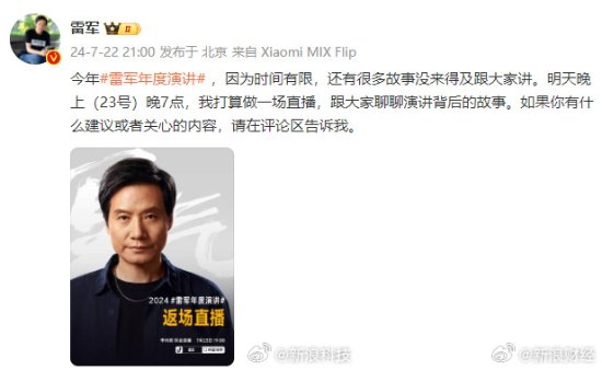 雷军近日发布消息称:“今年的年度演讲时间有限,有很多故事来不及与大家分享。为了满足大家的好奇心,我计划在7月23日晚7点进行一次直播,与大家分享演讲背后的故事。”