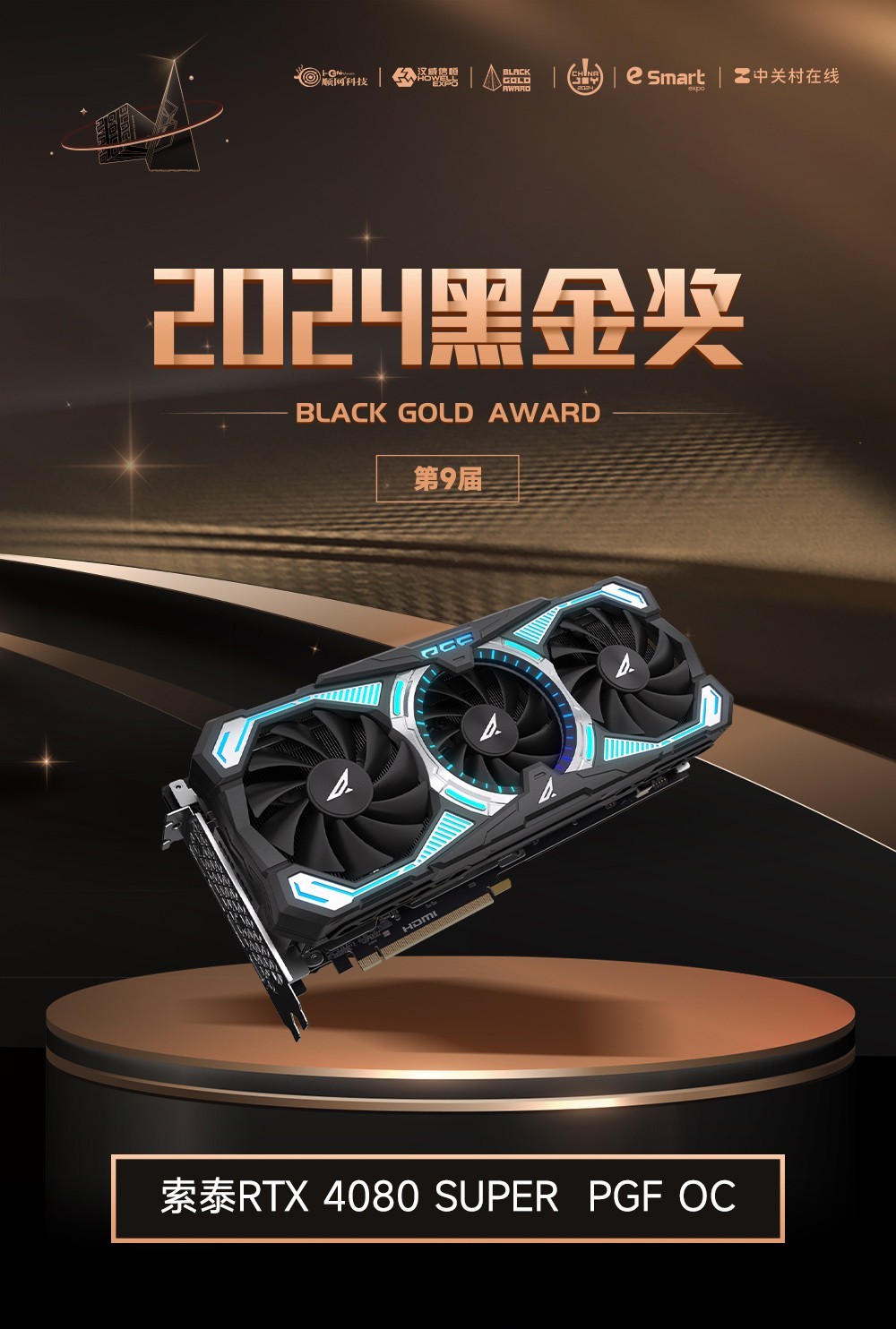 2024年7月27日,第九届ChinaJoy黑金奖(BlackGold AWARD)正式揭晓。索泰RTX 4080 SUPER ?PGF OC凭借着卓越的性能、出色的散热设计、丰富的灯光效果,荣获2024年度黑金奖。