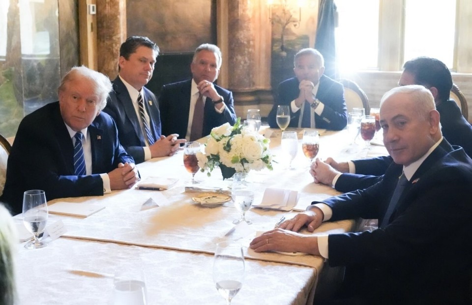 当地时间7月26日,美国前总统特朗普在海湖庄园和以色列总理内塔尼亚胡会面。图源:美联社