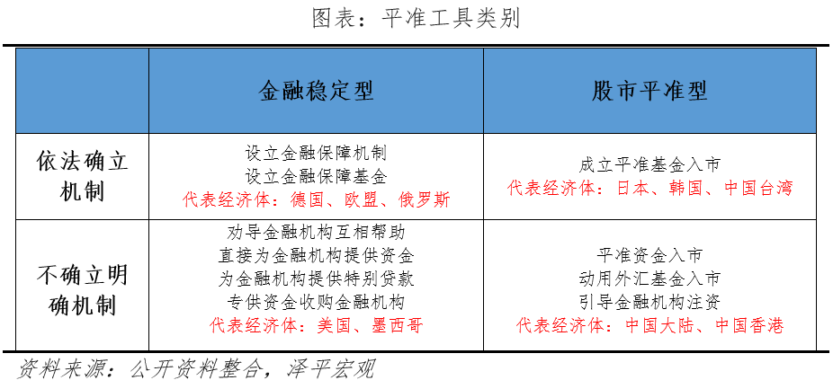 纵览各经济体过去30年经验,平准工具可大致分为“金融保障型”和“股市平准型”。“金融保障型”平准基金主要救机构而非救市场,只要对金融体系构成威胁,政府或央行均可通过发放贷款、收购等方式为注入流动性,优点是机制灵活、作用广泛,缺点是容易造成“大而不能倒”的预期,代表经济体是美国、欧盟,典型案例是次贷危机时美国联邦政府接管“两房”,抑制危机蔓延。“股市平准型”平准基金主要救市场而非救机构,通过在资本市场购买股票、ETF等方式支撑股市信心,优点是提振资本市场预期,缺点是股市影响因素较为复杂,而且如何退出需要智慧,代表经济体为日本、中国香港。