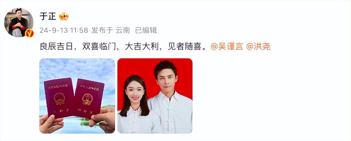 对此,于正发文祝福:“良辰吉日,双喜临门,大吉大利,见者随喜。”