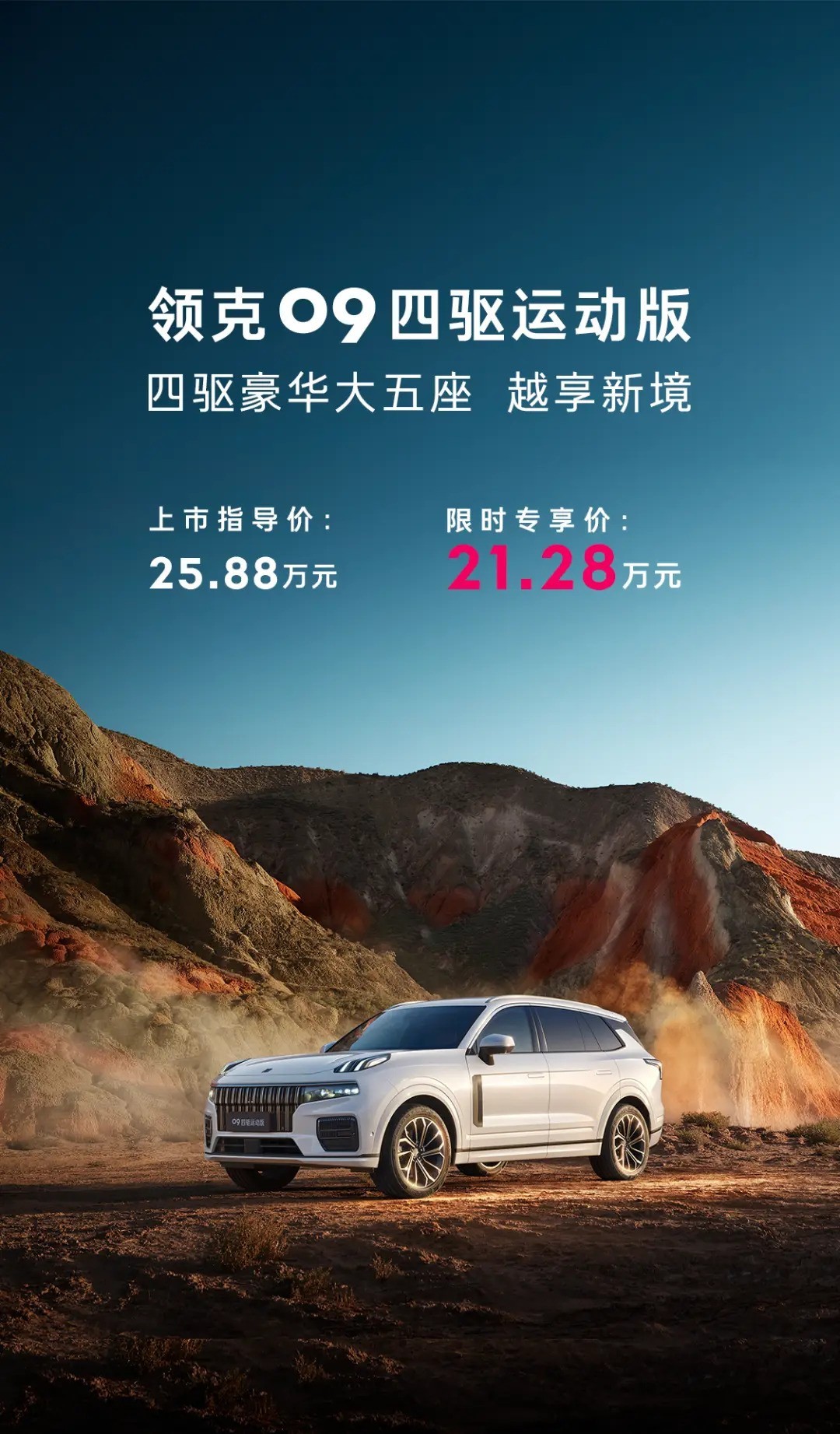 领克09四驱运动版车型今日正式上市,指导价为25.88万元。该车搭载了2.0T发动机和48伏轻混系统,并配备了FYRA全时四驱系统。此外,该车采用五座布局。