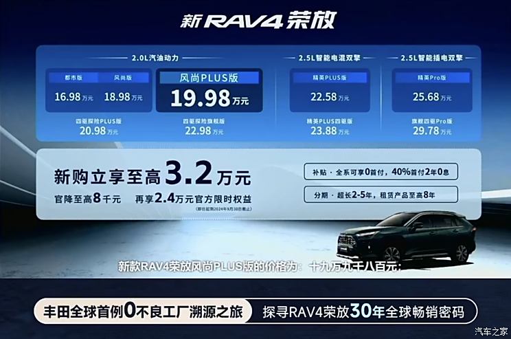 9月12日,丰田RAV4迎来了最新款的发布。这款新车共推出了9款车型,售价范围从16.98万元到29.78万元。起价下调了7000元。官方消息称,新购车主将享受至高3.2万元的优惠,并且还可以享受8000元的官降以及长达2.4万元的官方限时权益(有效期截至9月30日)。此外,购车还可选择零首付和最长5年的分期付款。