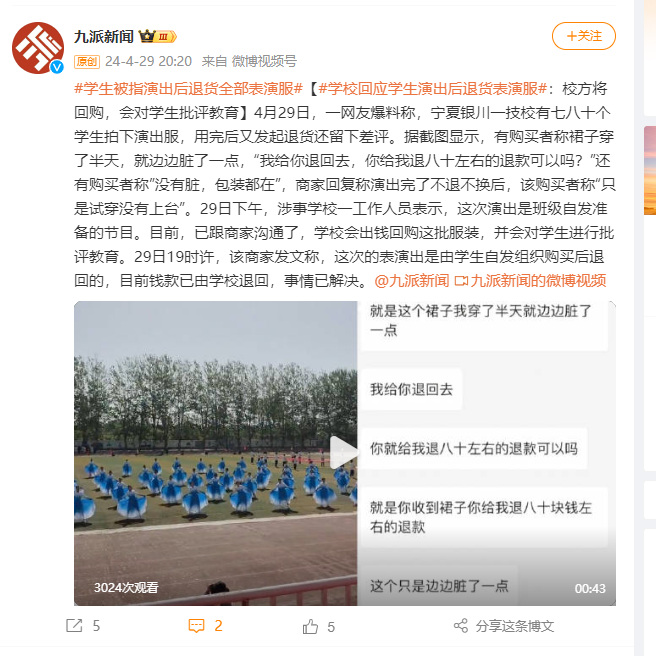 4月29日,一网友爆料称,宁夏银川一技校有七八十个学生拍下演出服,用完后又发起退货还留下差评。据截图显示,有购买者称裙子穿了半天,就边边脏了一点,“我给你退回去,你给我退八十左右的退款可以吗?”还有购买者称”没有脏,包装都在”,商家回复称演出完了不退不换后,该购买者称“只是试穿没有上台”。