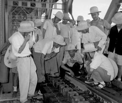 武汉长江大桥修建期间,建设者进行技术交流。中铁大桥局集团有限公司供图