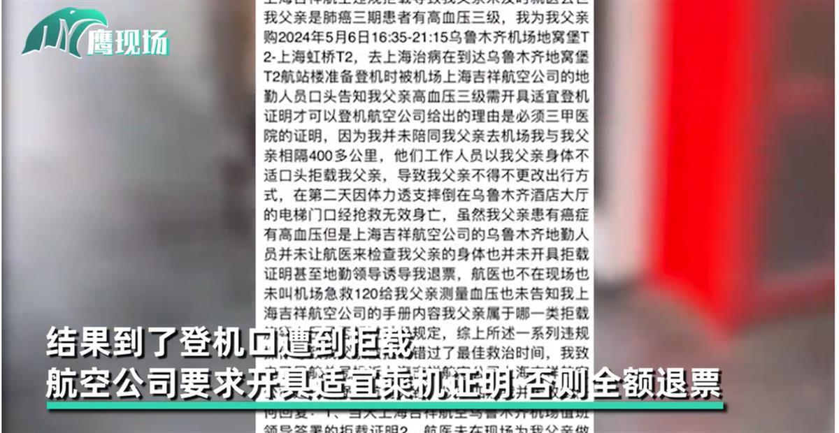 5月10日,有网友发文称,其父亲5月6日从乌鲁木齐乘吉祥航空航班飞往上海治疗癌症,在出发机场被航空公司拒载。父亲只好准备改乘火车,次日在酒店电梯门口摔倒,经抢救无效身亡。10日,吉祥航空方面回应称,这名轮椅旅客身体虚弱、说话困难且无陪同家属,经了解患多项重疾,家属未能提供适宜乘机证明,航司于是安排旅客终止行程。(据5月10日极目新闻)