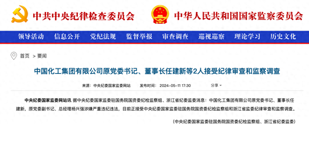 5月11日,据中央纪委国家监委网站消息,中国化工集团有限公司原党委书记、董事长任建新,原党委副书记、总经理杨兴强涉嫌严重违纪违法,目前正接受中央纪委国家监委驻国务院国资委纪检监察组和浙江省监委纪律审查和监察调查。