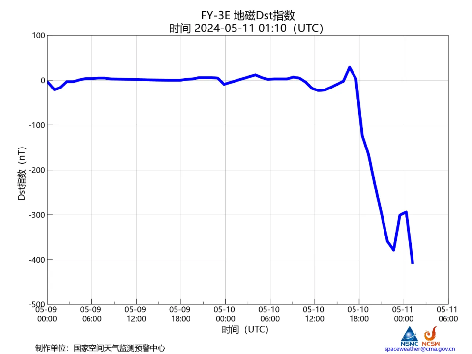 通过风云卫星空间地磁监测数据可以看到,磁暴发生时地磁Dst指数已经下探到负400nT以下,能排在“地磁活动排行榜”的第三位。