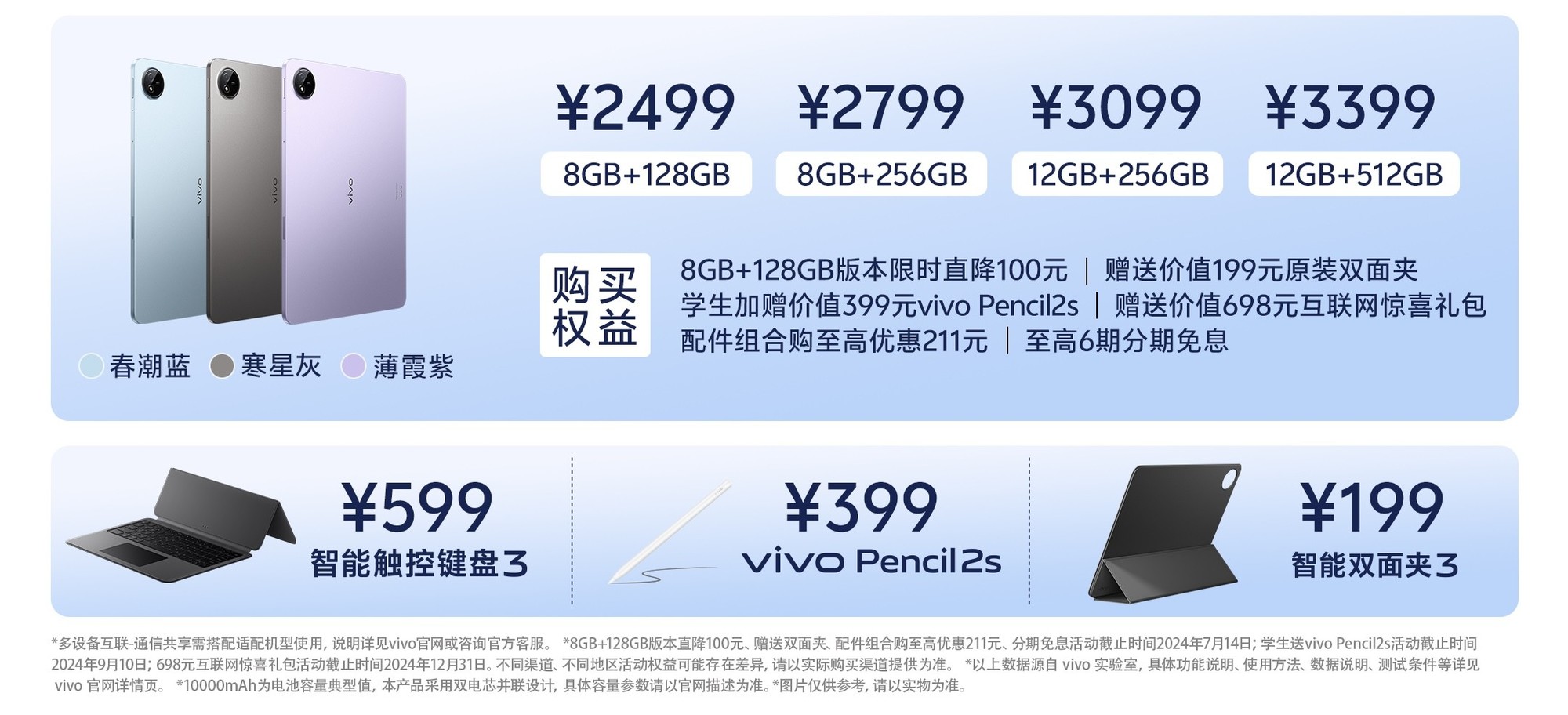 7月5日,vivo Pad3正式开售,价格2499元起。首销期间,8GB+128GB版本直降100元、并赠送平板智能双面夹3、学生购机加赠vivo Pencil2s、配件组合购至高优惠211元、下单可享至高6期分期免息以及698元互联网惊喜礼包。集影音娱乐和学习创作于一体的旗舰平板,欢迎入手体验!