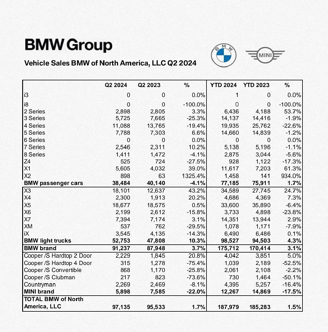 根据最新发布的销量数据,宝马品牌在北美地区市场表现出色。截至2024年第二季度,宝马品牌总销量达到91,237辆,同比增长3.7%。累计上半年销量更是高达175,712辆,同比增长3.1%。