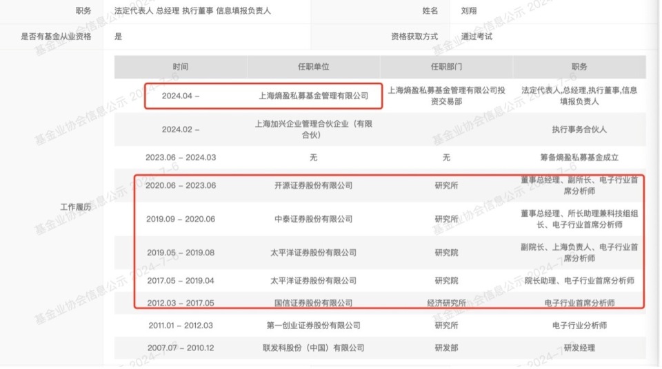 刘翔的履历显示,他自2011年进入证券行业,2012年开始担任电子行业首席分析师,历经国信证券、太平洋证券、中泰证券以及开源证券的首席分析师,在开源证券期间,他还担任公司董事总经理、研究所副所长。