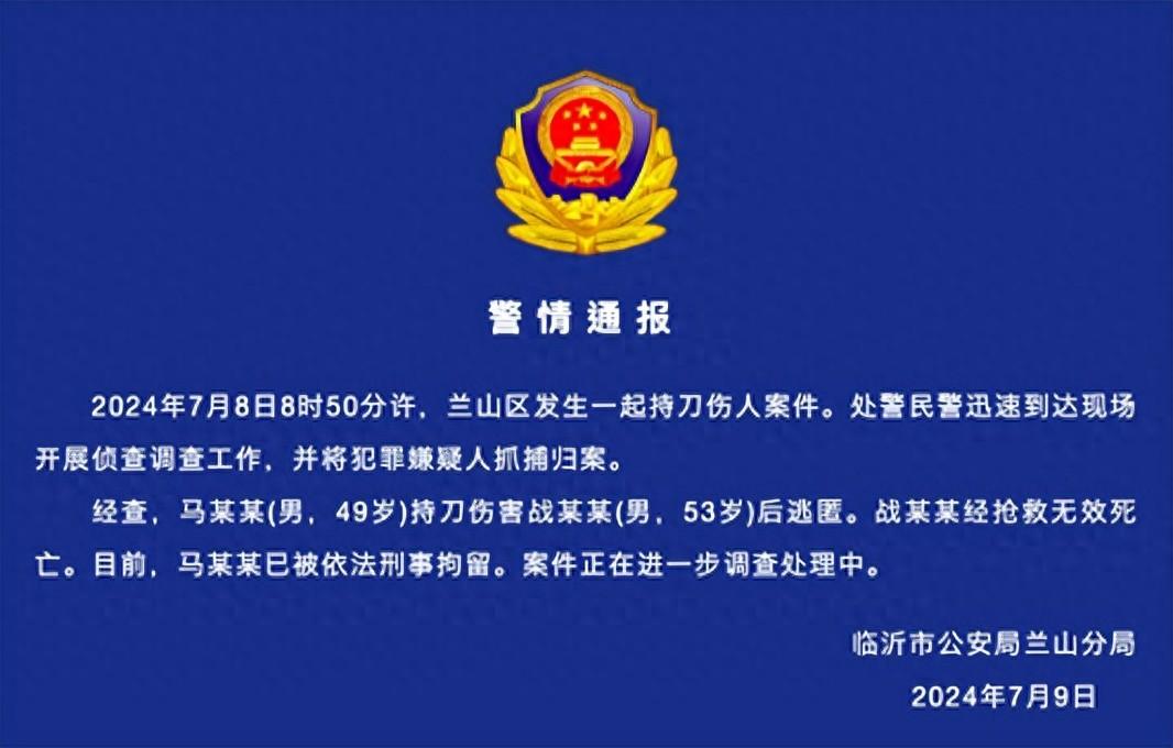 7月9日,据兰山公安消息:2024年7月8日8时50分许,兰山区发生一起持刀伤人案件。处警民警迅速到达现场开展侦查调查工作,并将犯罪嫌疑人抓捕归案。