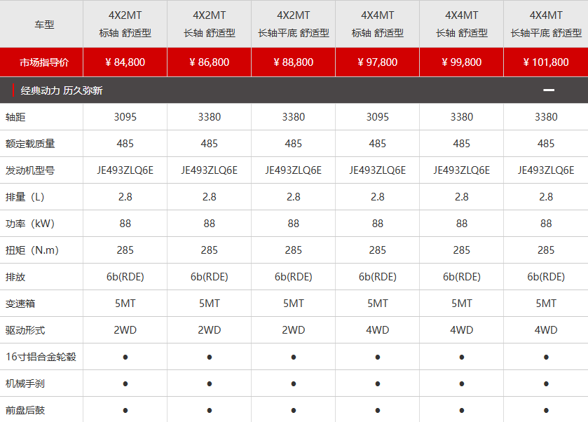 在动力系统方面,新车搭载全新的2.8T柴油发动机,最大功率为88千瓦,最大扭矩为285牛?米,并匹配5速手动变速器。此外,在配置上也有所差异:标轴车型配备后雾灯、卤素后视镜转向灯、前拖车钩等;长轴车型增加货厢耐磨胶涂层;平底货厢长轴车型增加侧踏板。