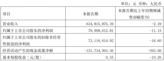 2024年第一季度,公司实现营业收入6.35亿元,同比下降2.39%;归属于上市公司股东的净利润7999.86万元,同比下降11.15%;归属于上市公司股东的扣非净利润7311.66万元,同比下降16.60%;经营活动产生的现金流量净额为-1.52亿元,上年同期为5167.05万元。