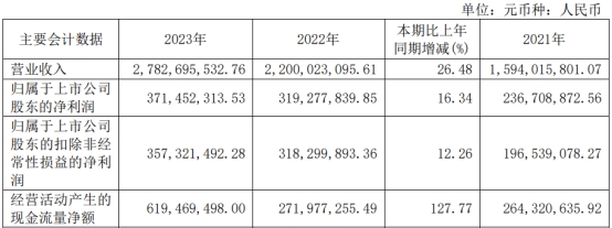2023年,华康股份实现营业收入27.83亿元,同比增长26.48%;归属于上市公司股东的净利润3.71亿元,同比增长16.34%;归属于上市公司股东的扣除非经常性损益的净利润3.57亿元,同比增长12.26%;经营活动产生的现金流量净额为6.19亿元,同比增长127.77%。