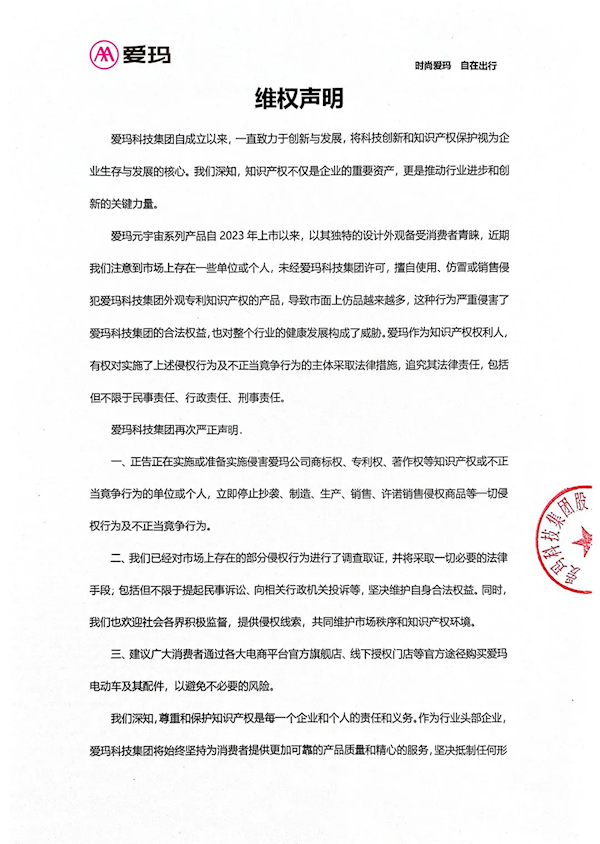 爱玛电动车今日发布严正声明,对市场上未经许可的仿冒行为进行了谴责,并宣布将采取一切必要的法律手段来保护自己的知识产权和合法权益。声明中指出,爱玛元宇宙系列产品自2023年上市以来备受消费者喜爱,然而近期市场上却出现了一些单位或个人未经授权使用、仿冒或销售侵犯爱玛外观专利知识产权的产品。这种行为严重侵害了爱玛科技集团的合法权益,也对整个行业健康发展构成威胁。