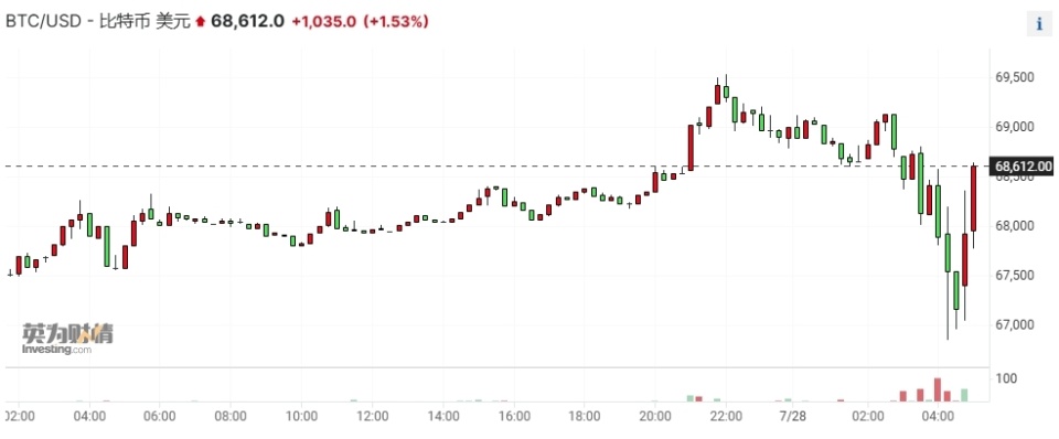 在他讲话期间,比特币走出V型行情,先是短线下挫1200美元,跌破6.7万美元关口;到了演讲结尾时,又暴力拉升, 收复了全部跌幅。截至发稿,比特币突破了6.9万美元/枚。