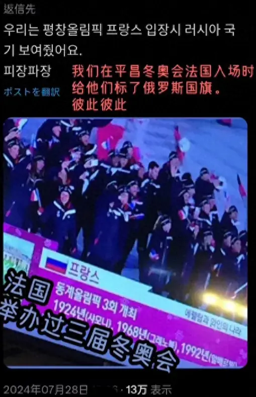 18年平昌冬奥会,当时韩国人把法国国旗错标成了俄罗斯国旗。
