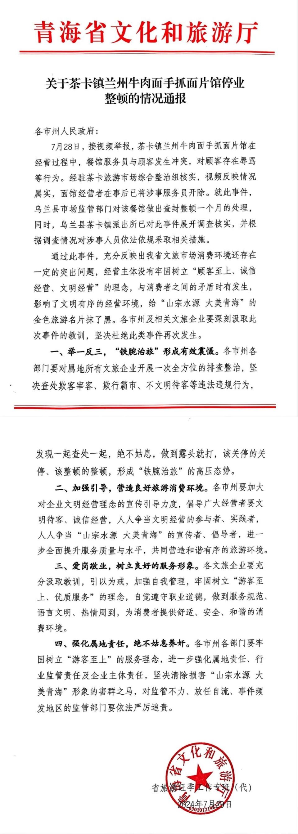 7月30日,青海省文化和旅游厅发布《情况通报》内容如下: