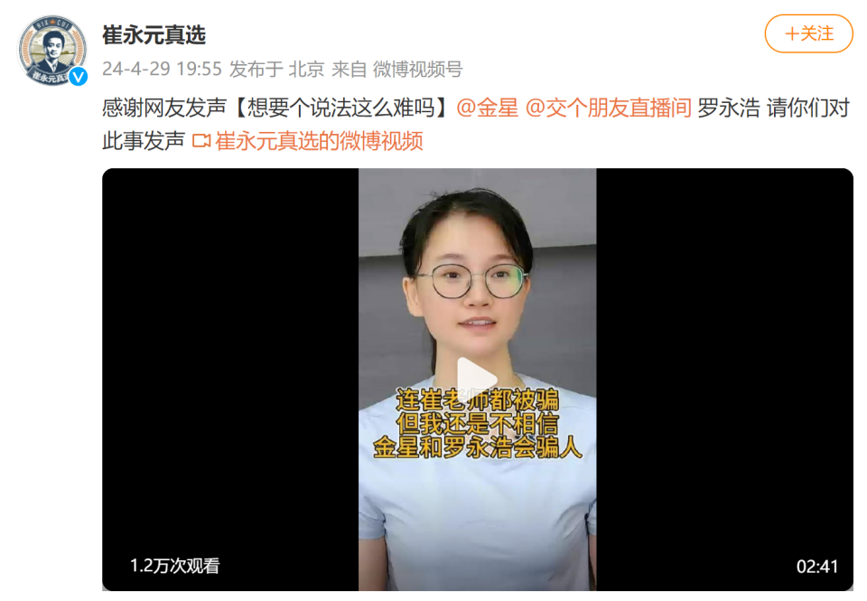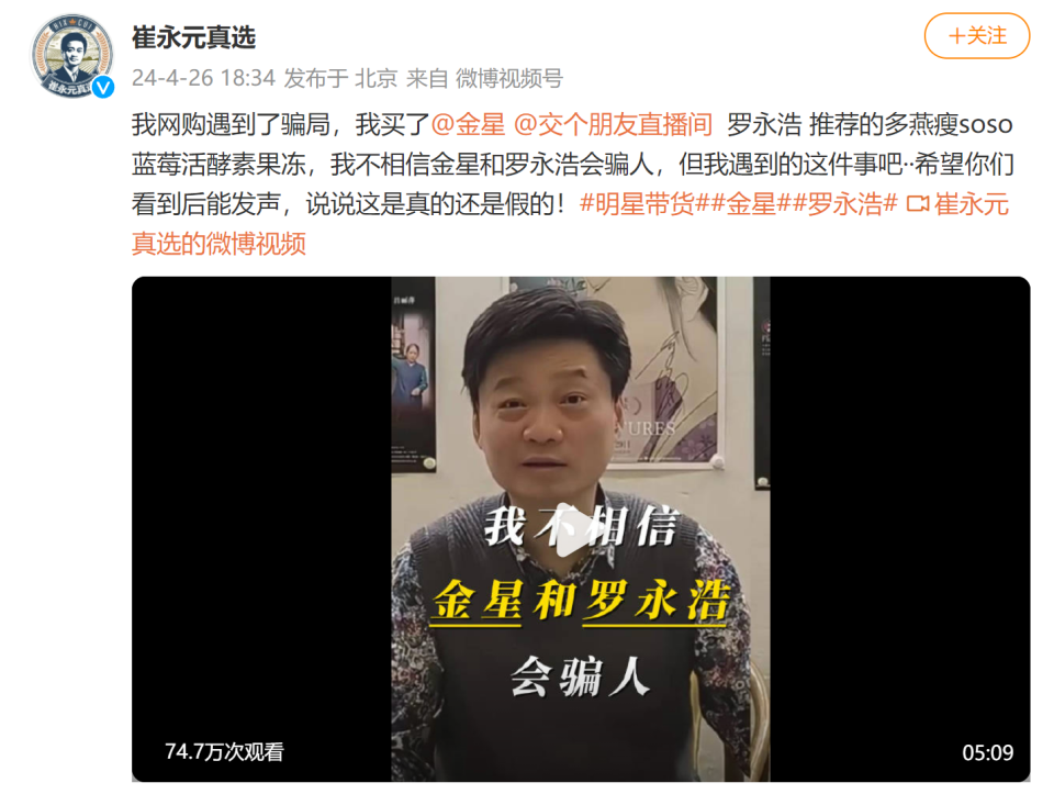 交个朋友回应崔永元喊话罗永浩卖骗子产品:不存在,从未提及有减肥功效