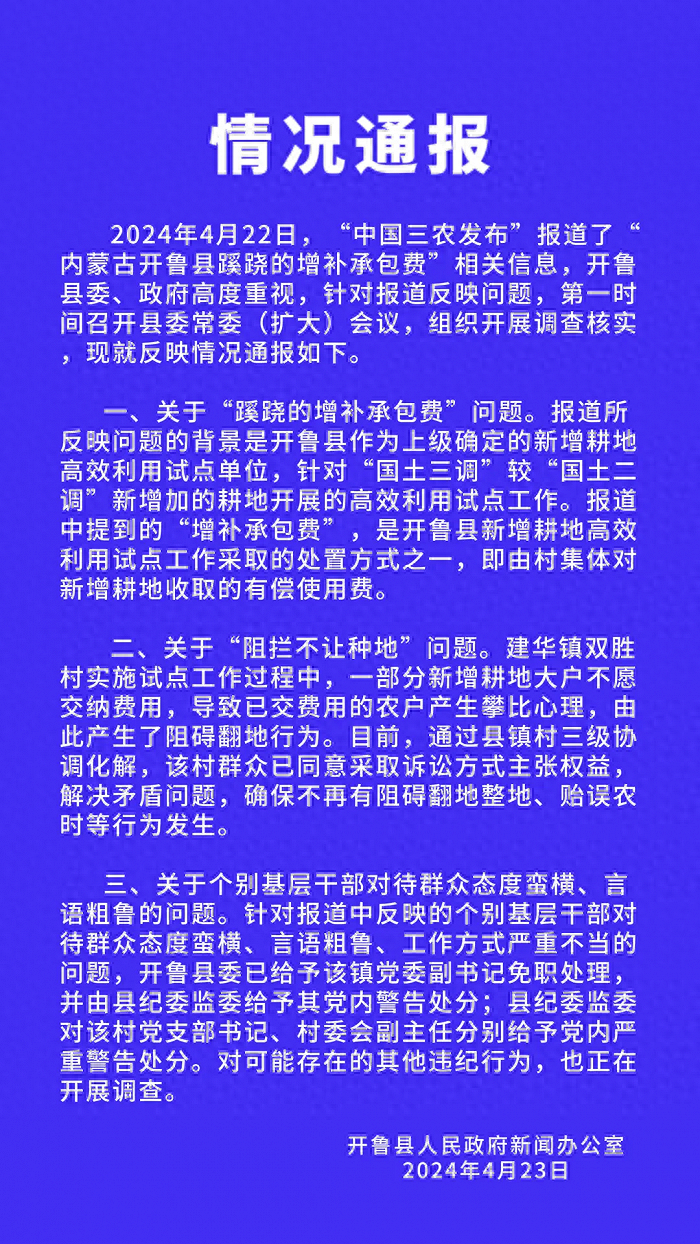 4月23日,内蒙古开鲁县再发布情况通报。通报称,报道中提到的“增补承包费”,是开鲁县新增耕地高效利用试点工作采取的处置方式之一,即由村集体对新增耕地收取的有偿使用费。针对报道中反映的个别基层干部对待群众态度蛮横、言语粗鲁、工作方式严重不当的问题,开鲁县委已给予该镇党委副书记免职处理,并由县纪委监委给予其党内警告处分;县纪委监委对该村党支部书记、村委会副主任分别给予党内严重警告处分。
