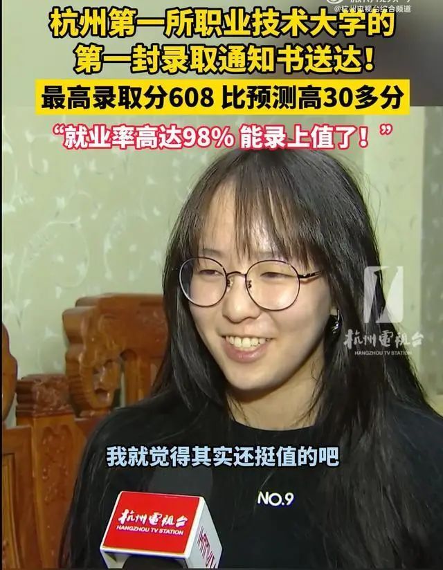 近日,浙江杭州一女生以高考602分的成绩去了一所职业技术大学,引发热议。有人认为是浪费人才,也有人表示“学校整体水平不错,是明智之举”。据杭州广播电视台报道,今年浙江机电职业技术学院顺利“专升本”,成为杭州第一所职业技术大学。7月21日晚,学校升本后的第一封录取通知书送到了富阳考生陈雨萱家中。