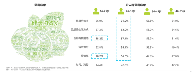 从年龄方面看,26-35岁的年轻群体尤其认可蓝莓的健康功效多、能代表品质的生活方式,以及食用有氛围感。