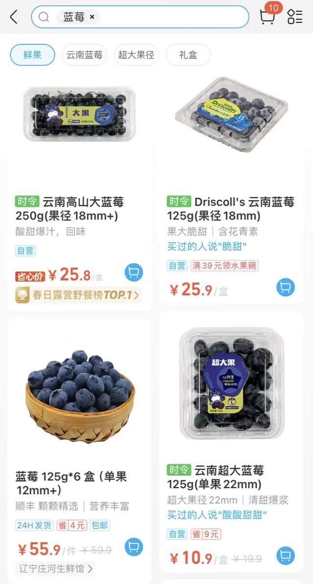 在盒马、小象超市生鲜搜索关键词“蓝莓”,产品多以果径为18毫米以上的大果为主,价格也以10元-30元/盒的亲民价格为主。