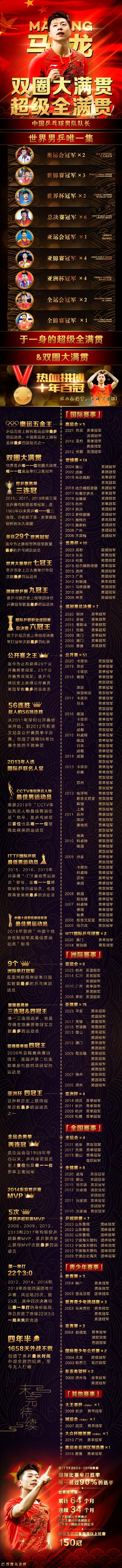 在获得WTT新加坡大满贯赛事的男双冠军后,马龙职业生涯已经拿到了150个冠军头衔。