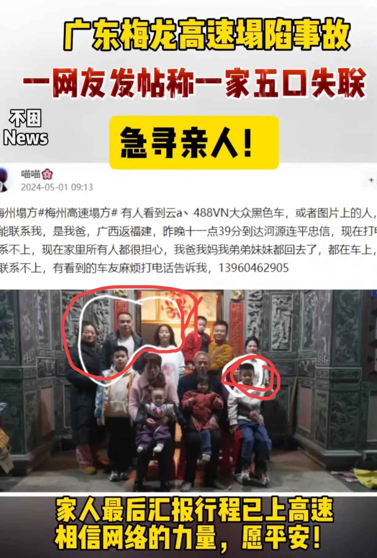 在这个世界的另一面,有一位网友向网上发出呼救。他表示自己一家五口人准备回家,在广东梅龙高速上刚好失联。五人的电话无法取得联系,他晒出的聊天记录显示,他的家人对他报了平安,之后他就失去了他们的音讯。