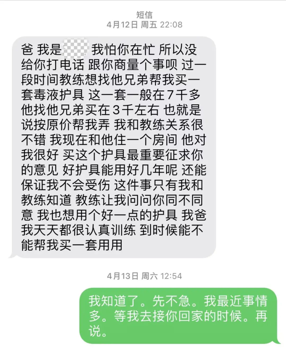 “我和教练关系很不错,我现在和他住一个房间,他对我很好,买这个护具最重要征求你的意见,好护具能用好几年呢,还能保证我不会受伤,这件事只有我和教练知道。教练让我问问你同不同意,我也想用个好一点的护具,爸我天天都很认真训练,到时候能不能帮我买一套用用。”短信中称。