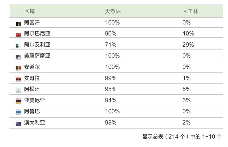 下表显示各个国家原始林与次生林(森林中有明显的人类活动迹象,但现在正在慢慢恢复到自然状态)和人工林的占比情况。
