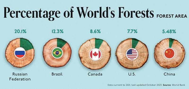 △俄罗斯、巴西、加拿大、美国、中国占世界森林的百分比。