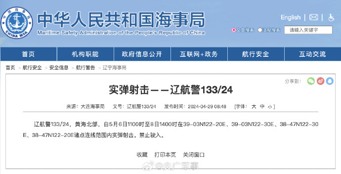 转载:https://new.qq.com/rain/a/20240502A01GY900 2024-05-02 09:30·正观新闻·发布于河南 大连海事局发布航行警告,自5月6日11时至8日14时,黄海北部部分海域实弹射击,禁止驶入。?(来源:中国海事局网站)