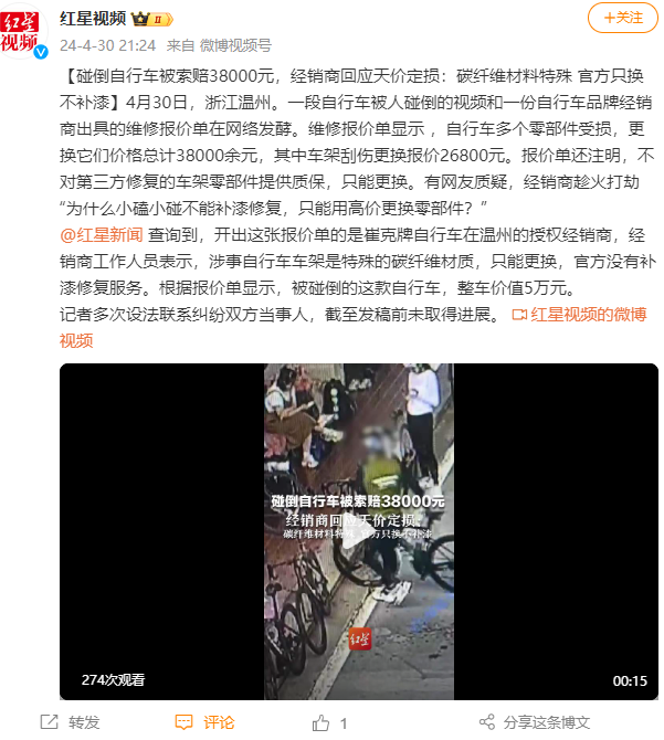 X4月30日,浙江温州。一段自行车被人碰倒的视频和一份自行车品牌经销商出具的维修报价单在网络发酵。维修报价单显示 ,自行车多个零部件受损,更换它们价格总计38000余元,其中车架刮伤更换报价26800元。报价单还注明,不对第三方修复的车架零部件提供质保,只能更换。有网友质疑,经销商趁火打劫“为什么小磕小碰不能补漆修复,只能用高价更换零部件?”