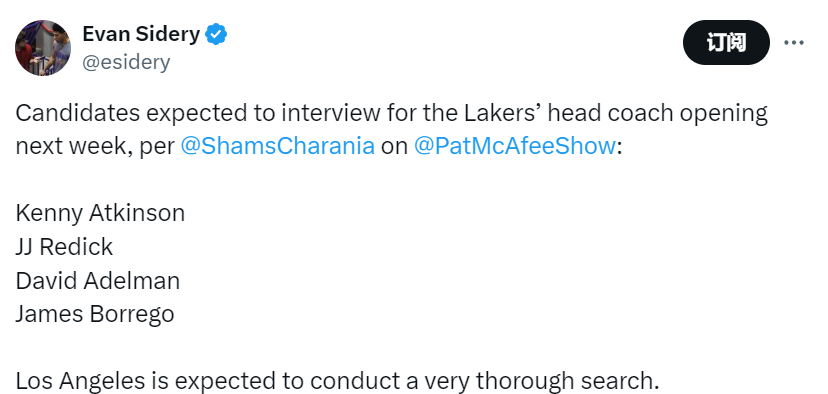 Shams透露了湖人下周选帅面试的四人名单,他们包括阿特金森、雷迪克、大卫-阿德尔曼和詹姆斯-博雷戈。湖人预计会面试更多教练,进行很彻底的调研后再确定新帅人选。