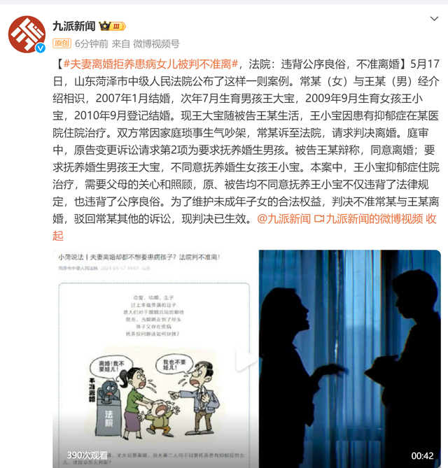 5月17日,山东菏泽市中级人民法院公布了这样一则案例。常某(女)与王某(男)经介绍相识,2007年1月结婚,次年7月生育男孩王大宝,2009年9月生育女孩王小宝,2010年9月登记结婚。现王大宝随被告王某生活,王小宝因患有抑郁症在某医院住院治疗。双方常因家庭琐事生气吵架,常某诉至法院,请求判决离婚。庭审中,原告变更诉讼请求第2项为要求抚养婚生男孩。被告王某辩称,同意离婚;要求抚养婚生男孩王大宝,不同意抚养婚生女孩王小宝。本案中,王小宝抑郁症住院治疗,需要父母的关心和照顾,原、被告均不同意抚养王小宝不仅违背了法律规定,也违背了公序良俗。为了维护未成年子女的合法权益,判决不准常某与王某离婚,驳回常某其他的诉讼,现判决已生效。@九派新闻