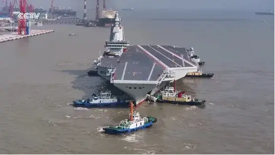 在上海江南造船厂码头,下水近两年的中国海军第三艘航母,纯国产的福建舰解开缆绳启航,开始首次海上试验。