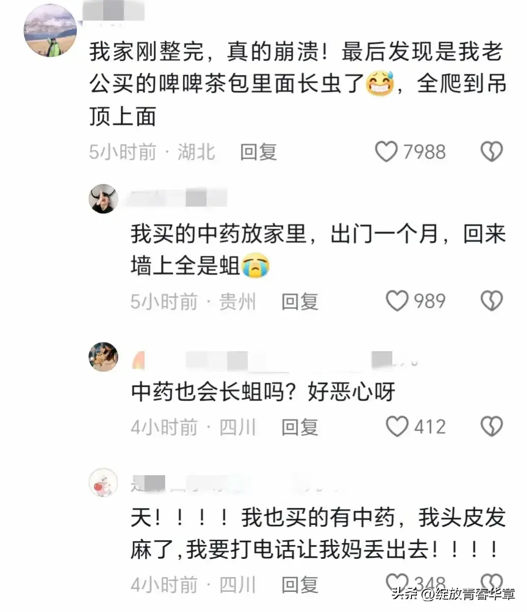 就像那位网友说的“我家刚整完,真的崩溃!”最后发现是老公买的啤啤茶包长虫爬上去的。这事儿给所有人都提了个醒,家居卫生容不得丝毫马虎。
