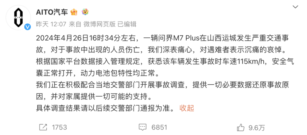 4月26日,一辆问界M7在侯平高速山西运城段追尾一辆道路养护车。事故造成问界M7起火,车上3人(包括一名2岁儿童)全部遇难。