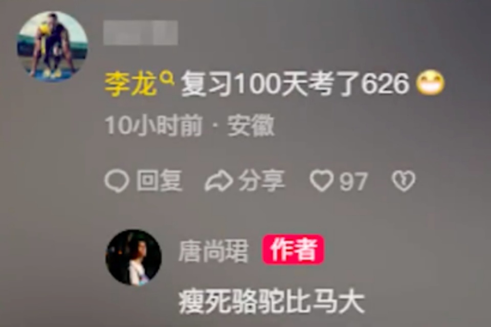 另据北京青年报报道,在李龙公布高考成绩后,有网友在唐尚珺社交账号下评论,称“李龙复习100天考了626”,似在感叹努力型和天赋型的差距。对此,唐尚珺回应:“瘦死骆驼比马大。”