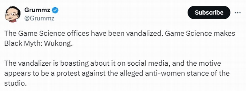 近日,一则令人震惊的消息在游戏界传开,《黑神话:悟空》的开发商——游戏科学深圳公司遭到恶意涂鸦。消息发出后,在社交媒体上引起了广泛关注,推特主Grummz主动参与了相关讨论,并发表了如下言论:“近日,《黑神话:悟空》开发商游戏科学深圳公司门口被人恶意涂鸦。此人在推特上大肆宣扬这件事情,其动机似乎是抗议该工作室‘歧视女性’立场。”