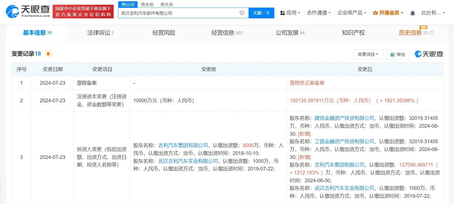 近日,武汉吉利汽车部件有限公司(以下简称“该公司”)发生工商变更。根据天眼查App的显示,建设银行(601939)旗下建信金融资产投资有限公司和工商银行(601398)旗下工银金融资产投资有限公司新增为该公司的股东。同时,该公司的注册资本由1亿人民币增至约19.2亿人民币。