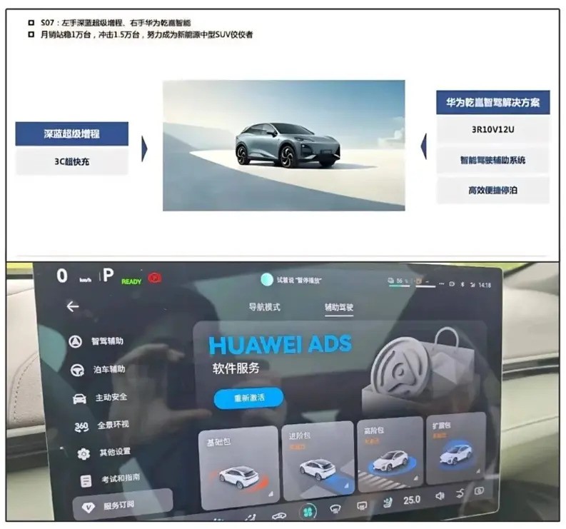 根据之前的信息显示,深蓝S07的界面设计仍与深蓝S7保持一致。然而,在屏幕上的辅助驾驶一栏中看到了华为ADS智驾系统的软件服务。这些服务分为基础包、进阶包、高阶包和扩展包等。