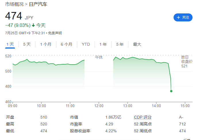 据日产汽车透露,本季度全球销量与去年同期持平,达到78.7万辆。然而,公司的净利润严重下滑,同比减少73%(分析师预期值为970.8亿日元)。这导致了日产股价在盘中下跌超过9%。