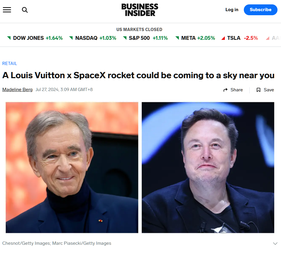 7月27日,世界首富杰夫·贝索斯与LV母公司董事长伯纳德·阿尔诺(又译贝尔纳·阿尔诺)的友谊引发热议。阿尔诺在采访中透露了这段非同寻常的友谊:“我非常钦佩他所做的一切。他在汽车公司取得如此成功是相当出乎意料的。他是一个天才,在火箭领域也取得了如此大的成功,这太不可思议了。”两人甚至曾讨论过合作推出一个品牌火箭的可能性。阿尔诺还提到自己与乔布斯的关系:乔布斯在开设Apple Store之前,曾向他咨询过如何打造良好的零售体验。阿尔诺建议他关注选址问题,甚至提出可以效仿LV的做法。