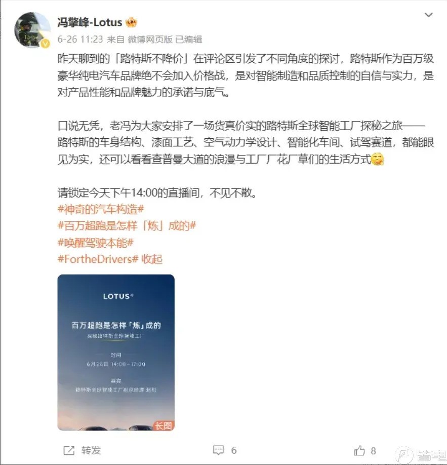 此外,冯擎峰还提到了路特斯在智能制造、品质控制、产品性能和品牌魅力方面的自信。他认为这些是企业可持续发展的重要因素,并表示自己坚守不降价这个底线的原因。