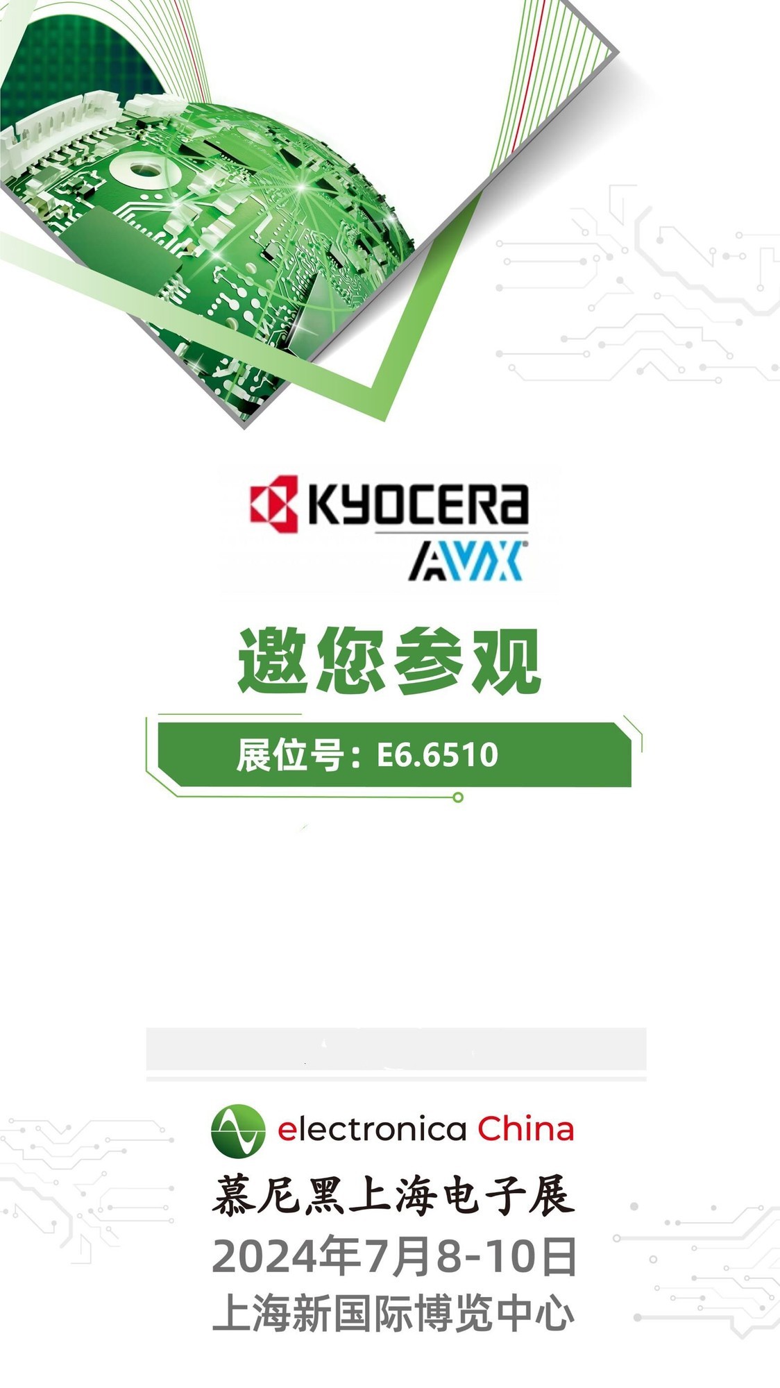 作为全球电子行业的盛会,慕尼黑上海电子展(electronica China)将于2024年7月8日至10日在上海新国际博览中心隆重举办。京瓷将携车载、通信领域的零部件、电子元器件产品和技术亮相,诚邀各位莅临京瓷展台(展位号:E6-6510),共同见证京瓷不断升级的前沿技术与创新产品,共探行业发展新趋势。
